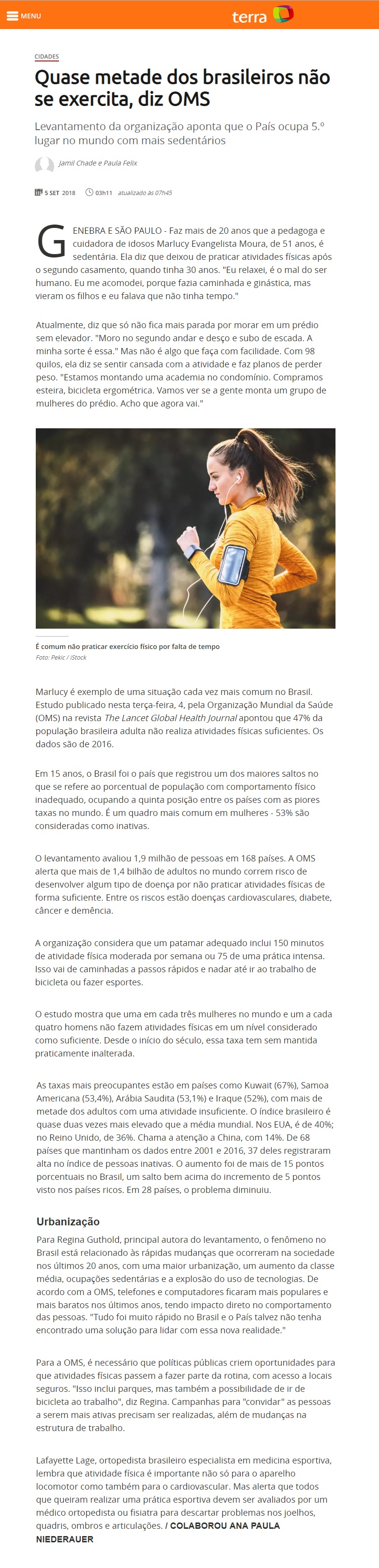 PORTAL TERRA - Quase metade dos brasileiros não se excercita, diz OMS