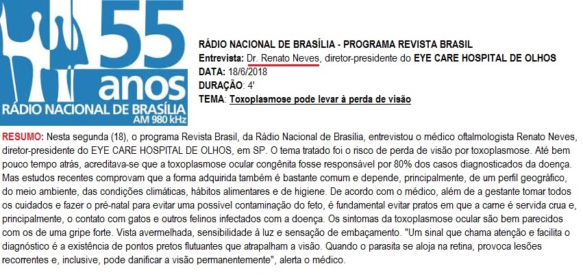Clipping RÁDIO NACIONAL DE BRASÍLIA - Entrevista com Dr. Renato Neves sobre toxoplasmose ocular 19/06/2018