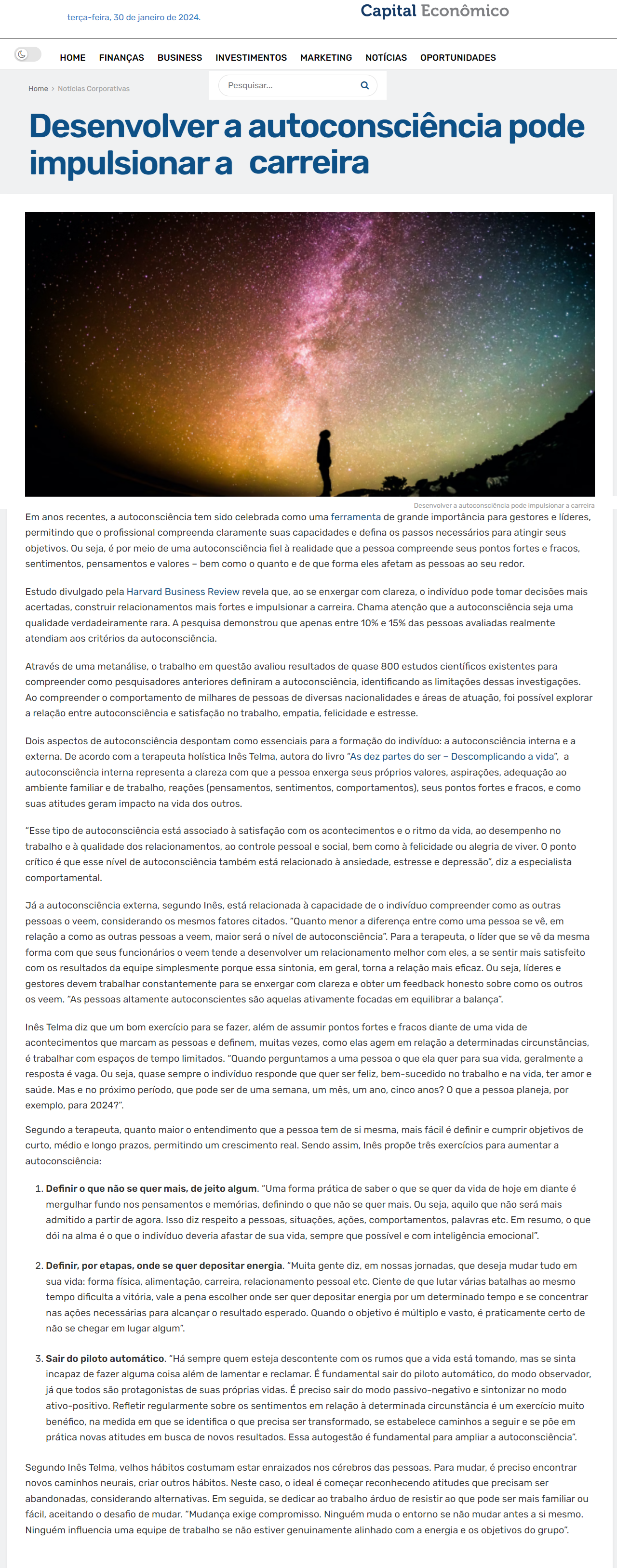 Clipping REVISTA CAPITAL ECONÔMICO - Desenvolver a autoconsciência pode impulsionar a carreira 30/01/2024