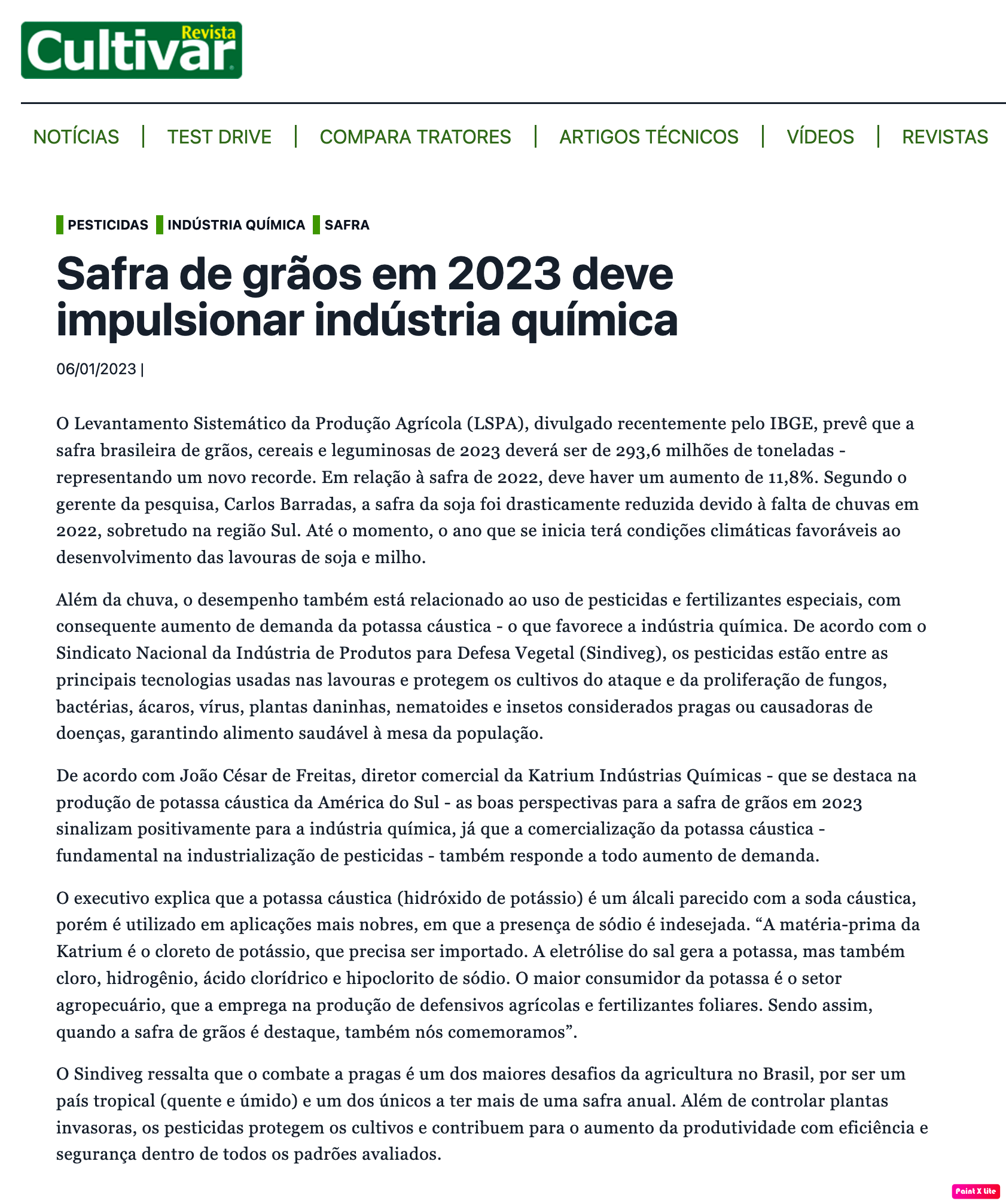 Clipping REVISTA CULTIVAR (ONLINE) - Safra de grãos em 2023 deve impulsionar indústria química 09/01/2023