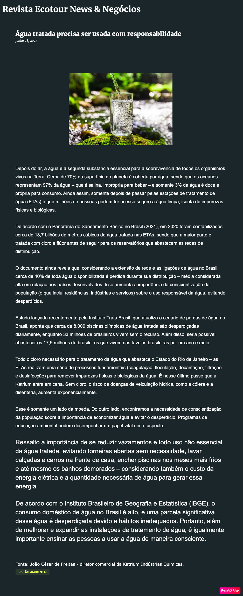 Clipping REVISTA ECOTOUR NEWS & NEGÓCIOS - Água tratada precisa ser usada com responsabilidade 28/06/2023