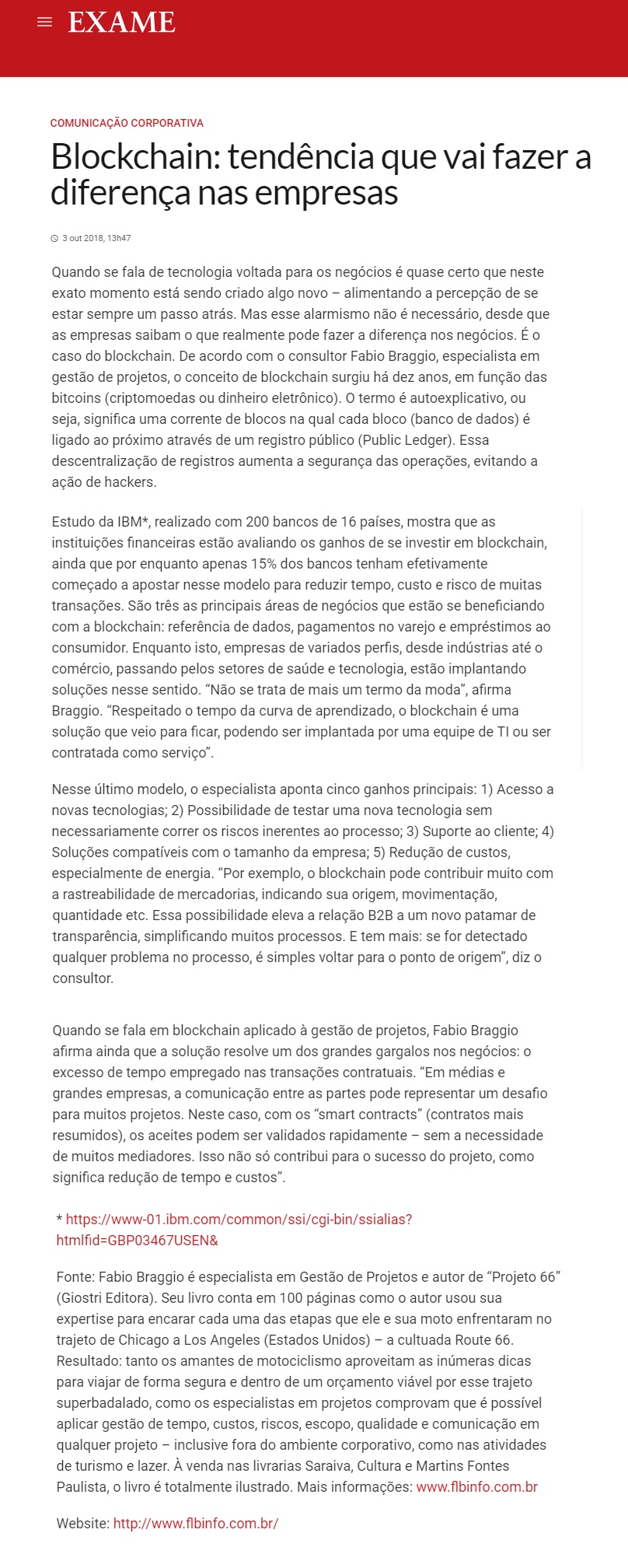 Clipping REVISTA EXAME (ONLINE) - Blockchain: tendência que vai fazer a diferença nas empresas 05/10/2018
