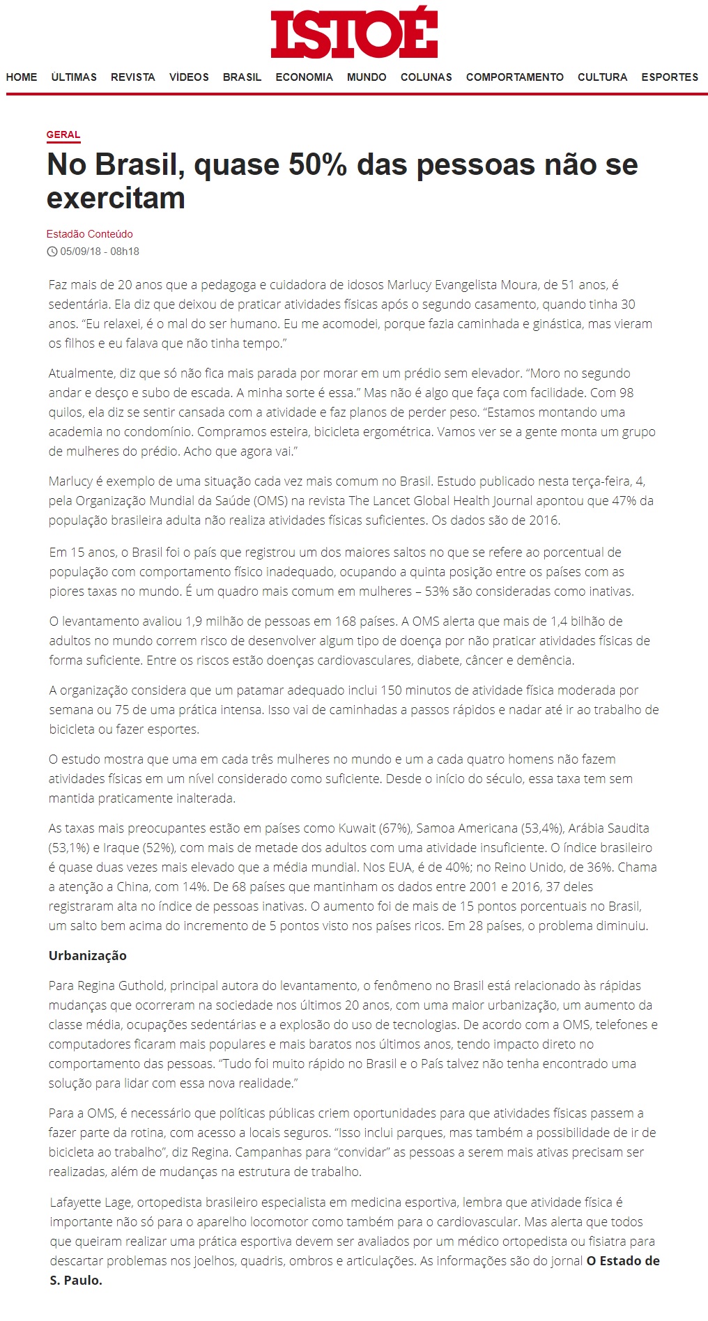 REVISTA ISTOÉ (ONLINE) - No Brasil, quase 50% das pessoas não se exercitam