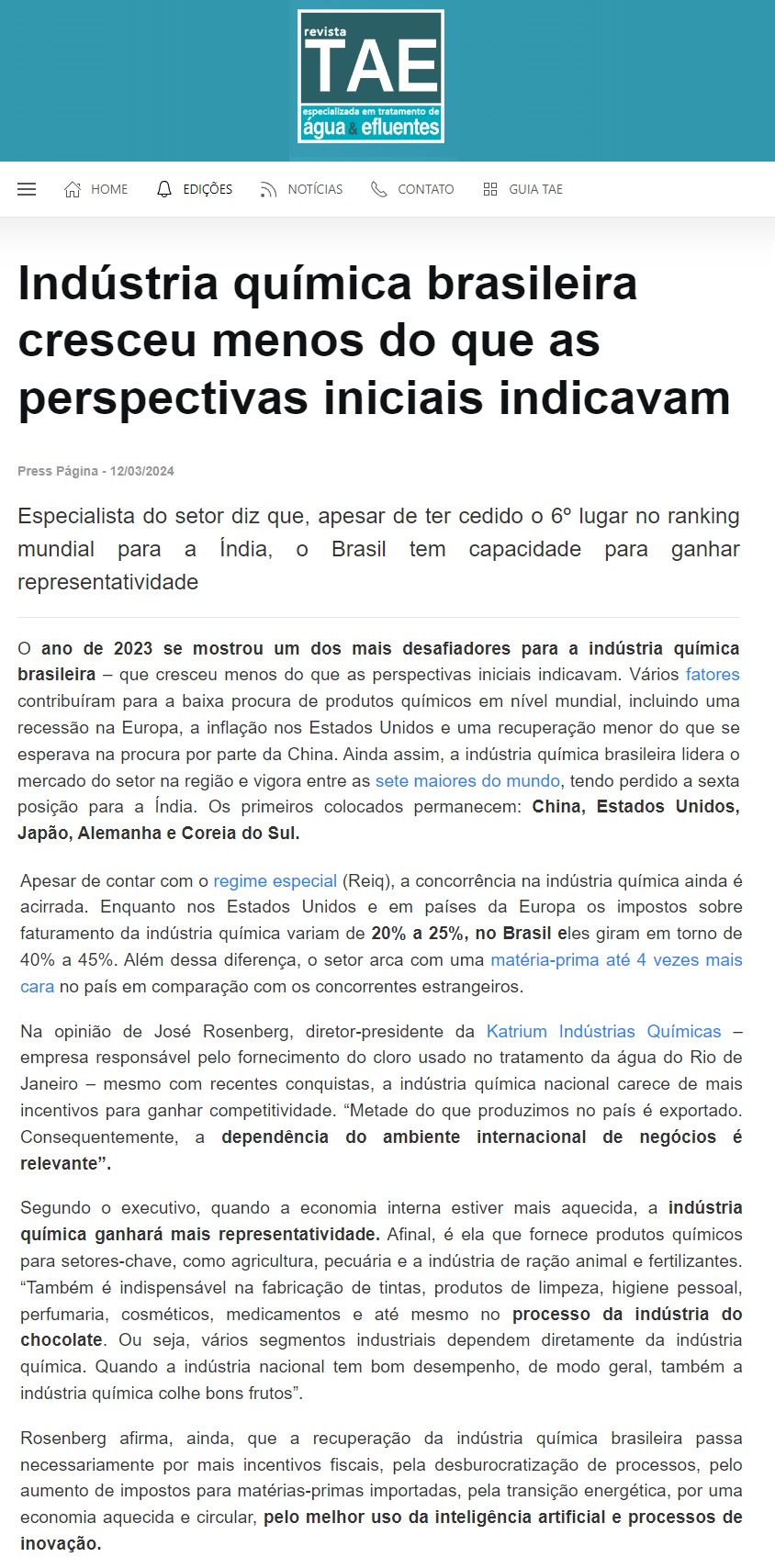 REVISTA TAE (ONLINE) - Indústria química encara desafios para crescer em 2024