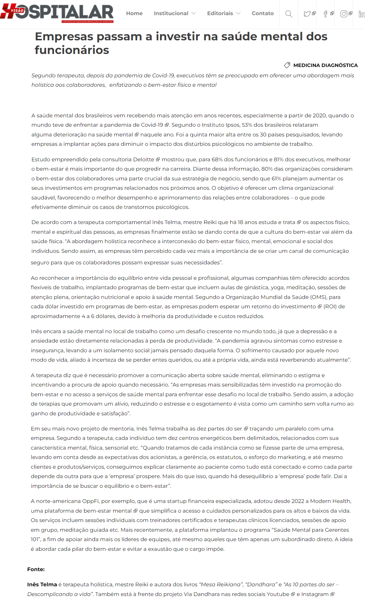 Clipping REVISTA VISÃO HOSPITALAR - Empresas passam a investir na saúde mental dos funcionários 14/02/2024