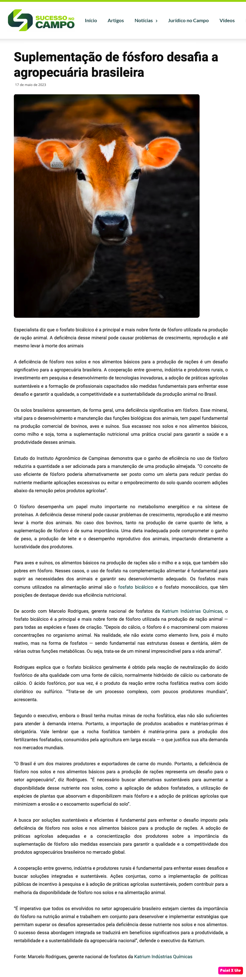 Clipping SUCESSO NO CAMPO (SITE) - Suplementação de fósforo desafia a agropecuária brasileira 20/05/2023