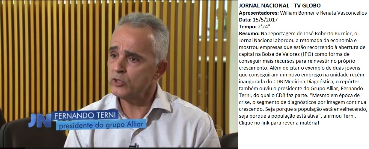 Notícias MÍDIA - Jornal Nacional entrevista presidente do Grupo Alliar 16/05/2017 http://g1.globo.com/jornal-nacional/edicoes/2017/05/15.html#!v/5871321