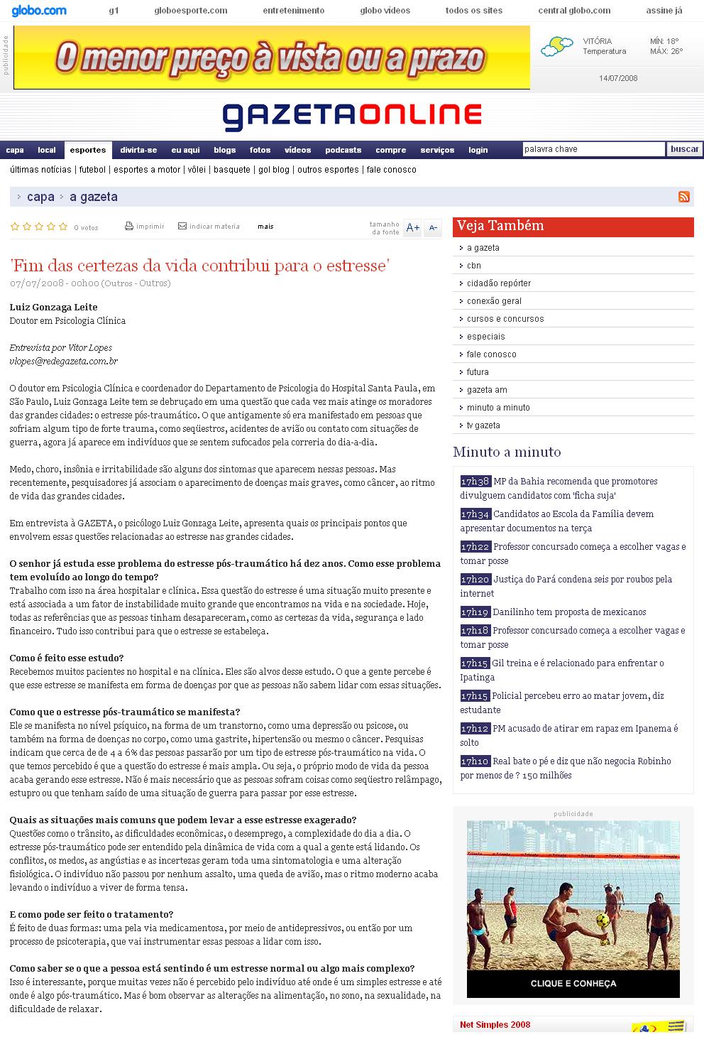 Clipping Jornal A Gazeta - ES (7 Jul) - Fim das certezas da vida contribui para o estresse 14/07/2008