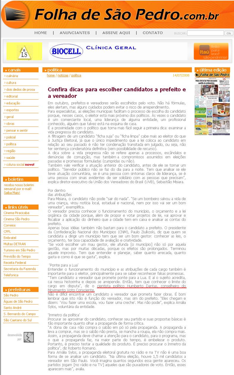 Clipping Folha de São Pedro (14 Jul) - Confira dicas para escolher candidatos a prefeito e vereador 18/07/2008
