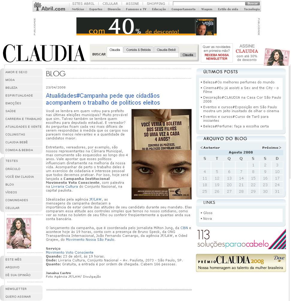 Clipping Blog da Revista Claudia - Campanha pede que cidadãos acompanhem trabalho de políticos 14/08/2008