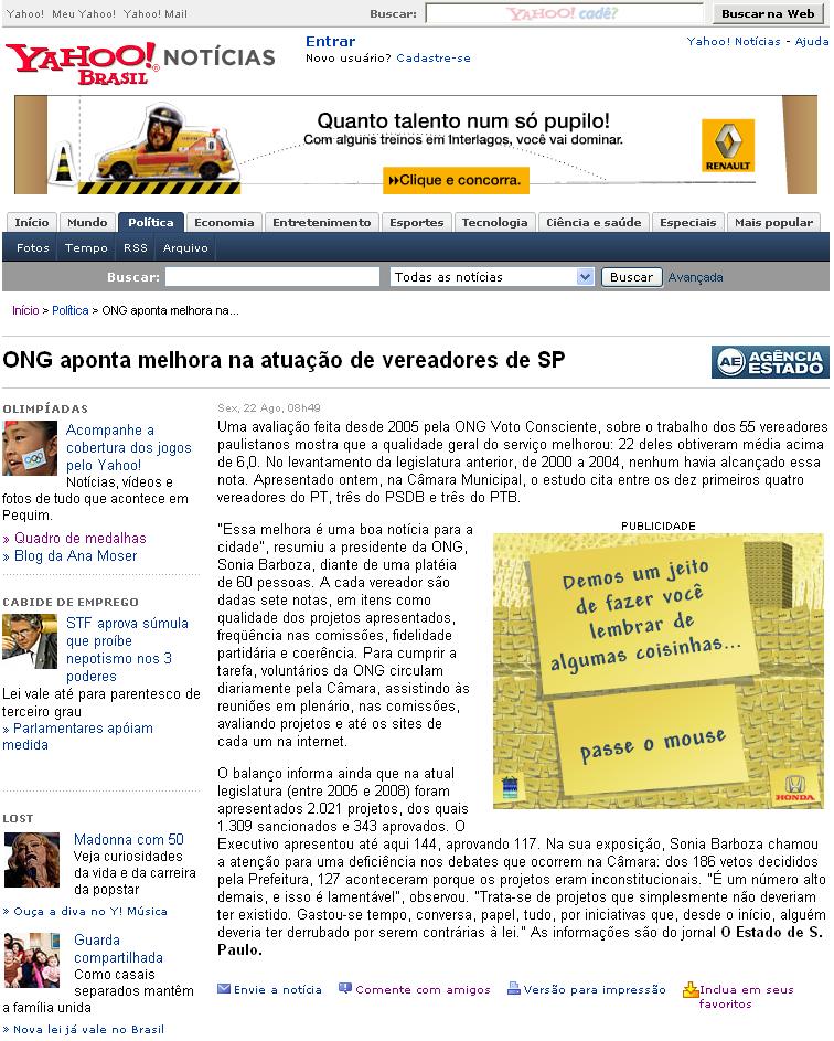 Portal Yahoo - ONG aponta melhora na atuação de vereadores de SP