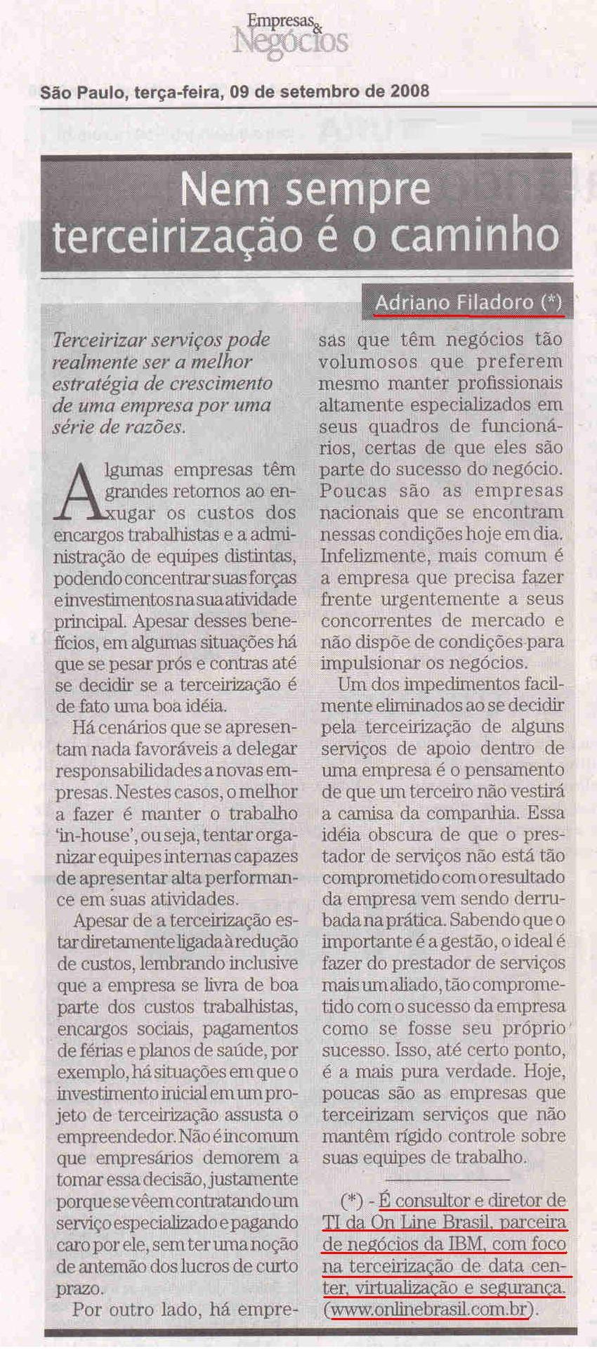 Jornal Empresas & Negócios (9 Set) - Nem sempre terceirização é o caminho