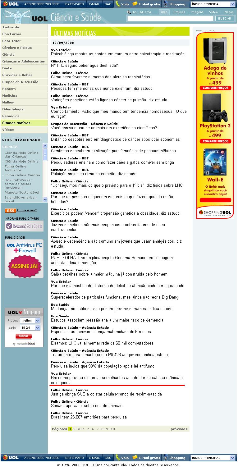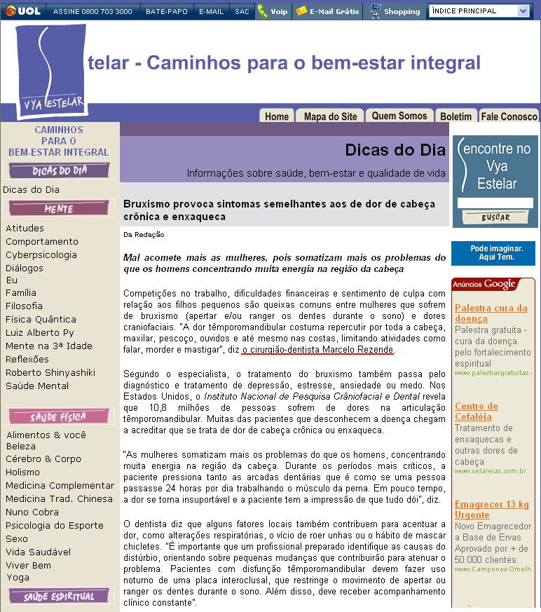 Clipping Portal UOL (Ciência & Saúde) - Bruxismo provoca sintomas semelhantes ao de dor de cabeça 11/09/2008