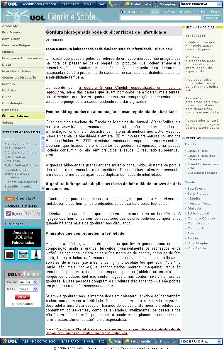 Clipping Portal UOL (Ciência & Saúde) - Gordura hidrogenada pode duplicar riscos de infertilidade 01/10/2008
