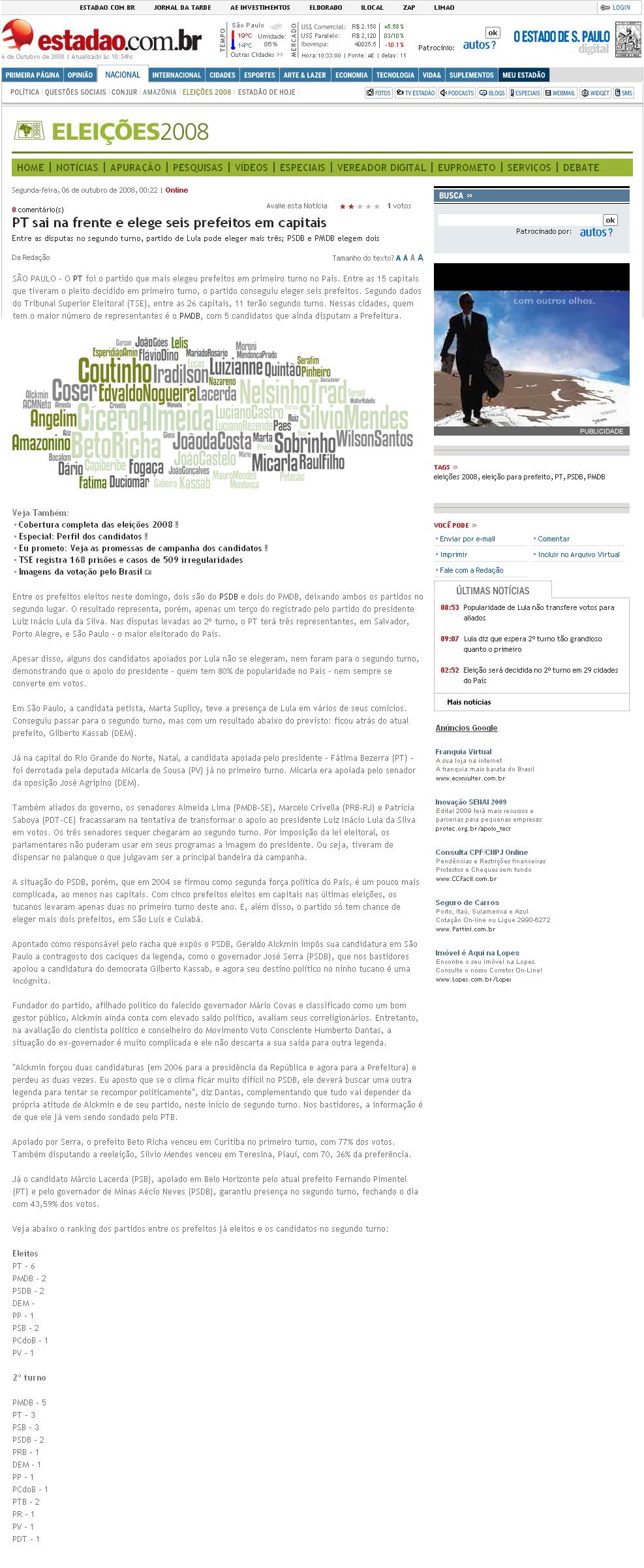 Portal Estadão - PT sai na frente e elege seis prefeitos em capitais