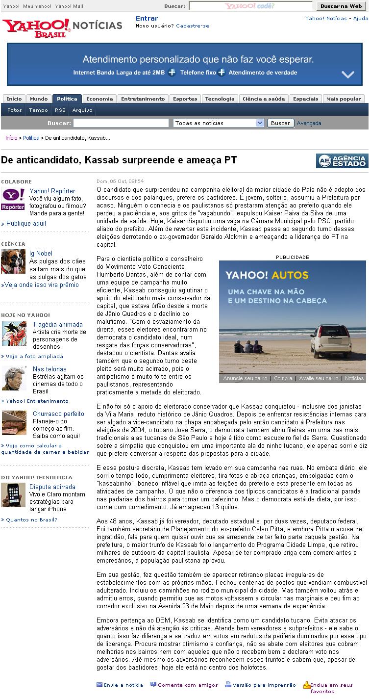 Portal Yahoo - De anticandidato, Kassab surpreende e ameaça PT
