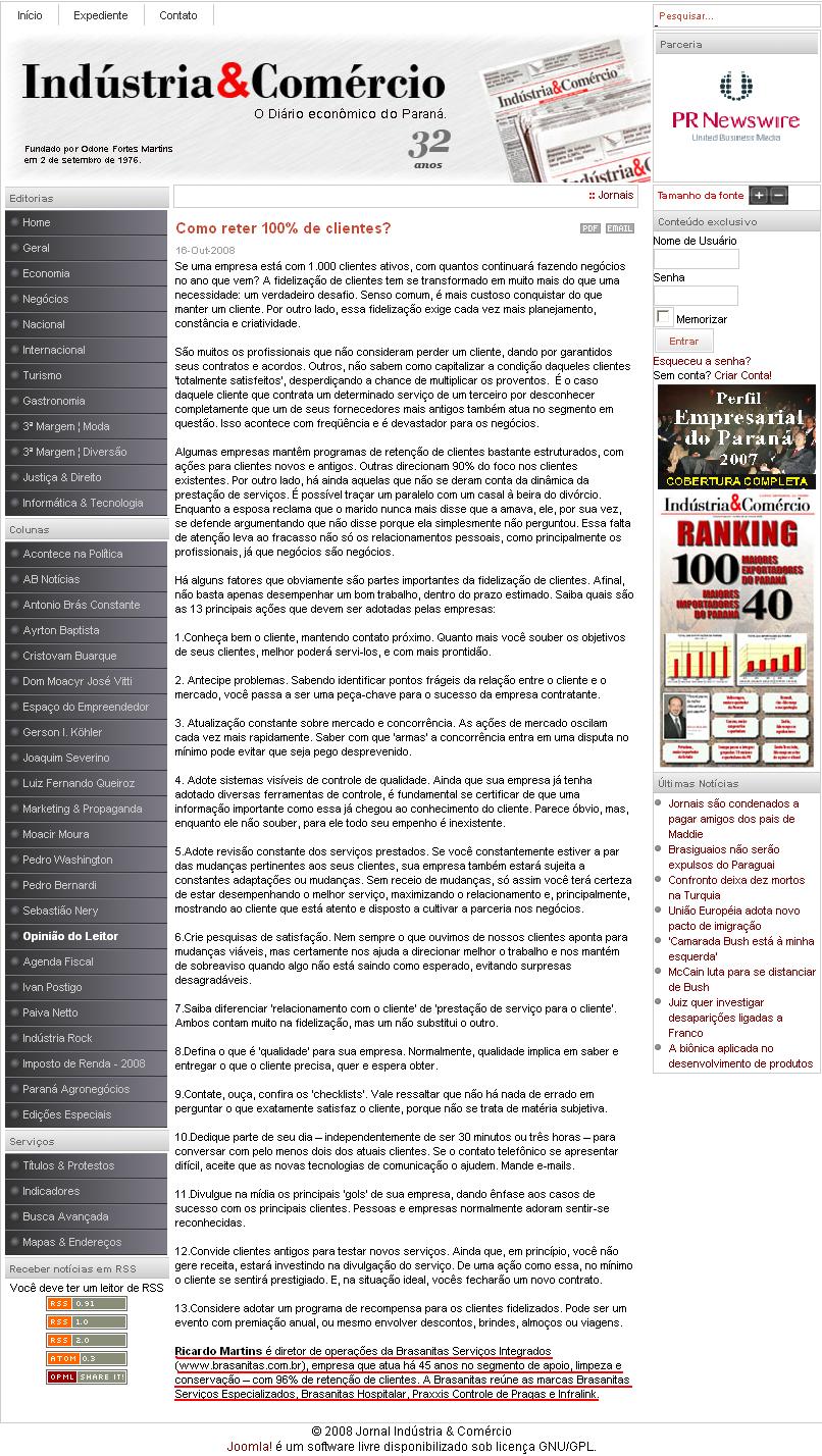 Jornal Indústria & Comércio (16 Out) - Como reter 100% de clientes?
