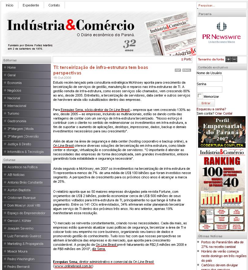 Clipping Jornal Indústria & Comércio (16 Out) - TI: terceirização de infra-estrutura tem boas perspectivas 17/10/2008