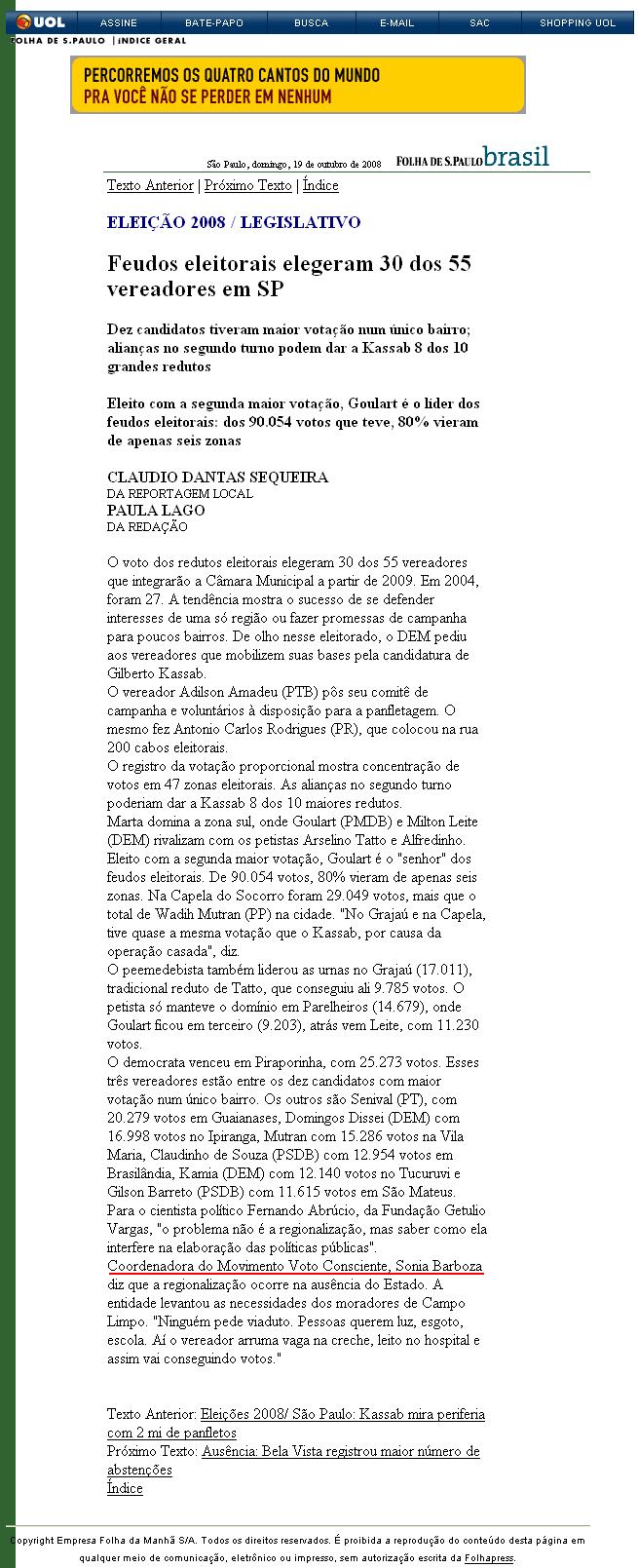 Clipping Folha de S. Paulo (19 Out) - Feudos eleitorais elegeram 30 dos 55 vereadores em SP 24/10/2008