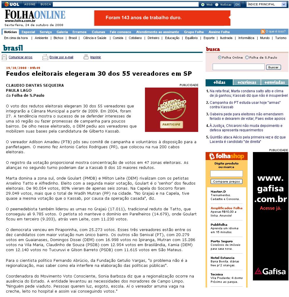 Folha on line - Feudos eleitorais elegeram 30 dos 55 vereadores de SP