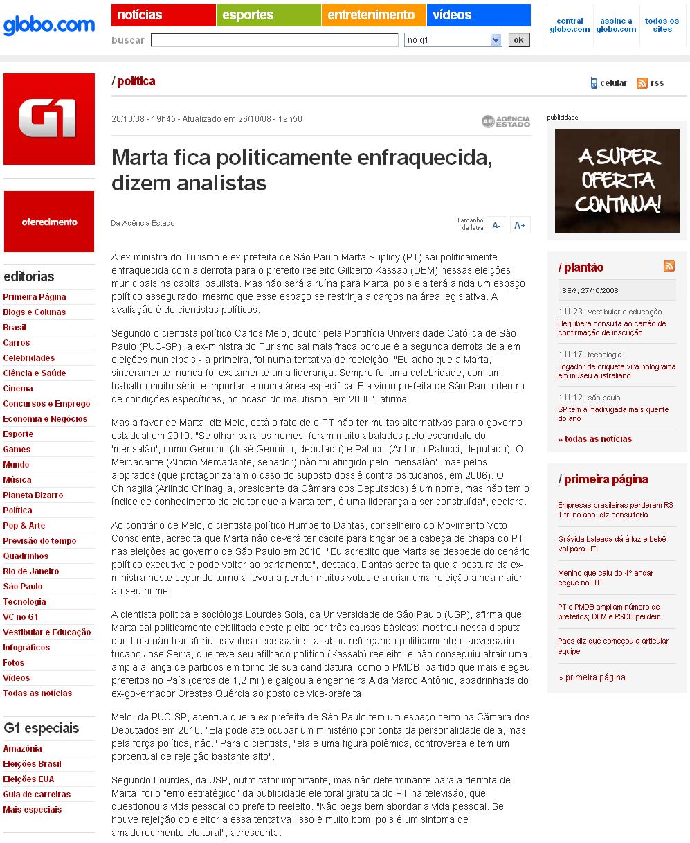 Portal G1 (Globo) - Marta fica politicamente enfraquecida, dizem analistas