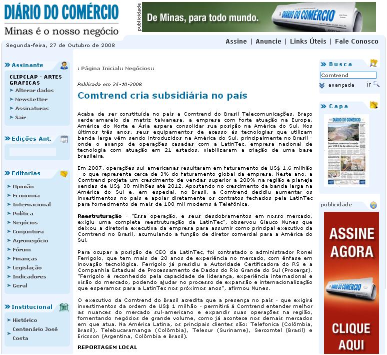 Diário do Comércio - MG (25 Out) - Comtrend cria subsidiária no país