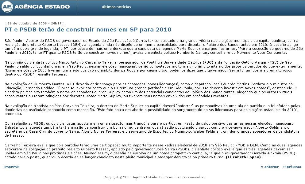Agência Estado (AE) - PT e PSDB terão de construir nomes em SP para 2010