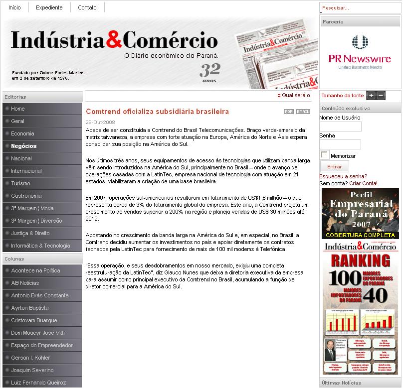 Clipping Jornal Indústria & Comércio (29 Out) - Comtrend oficializa subsidiária brasileira 30/10/2008