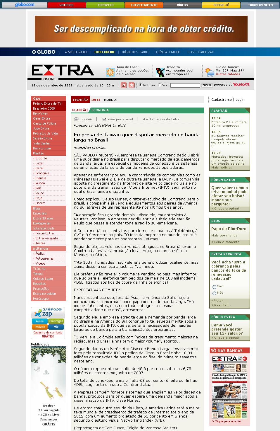 Clipping Jornal Extra on line (RJ) - Empresa de Taiwan quer disputar mercado de banda larga no Brasil 13/11/2008