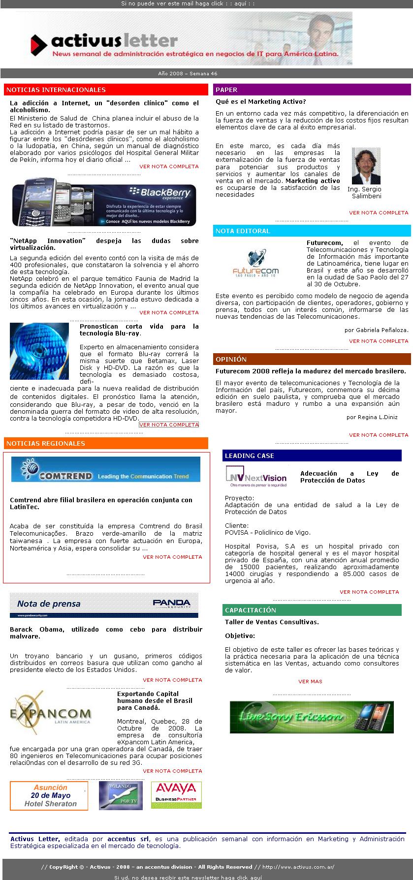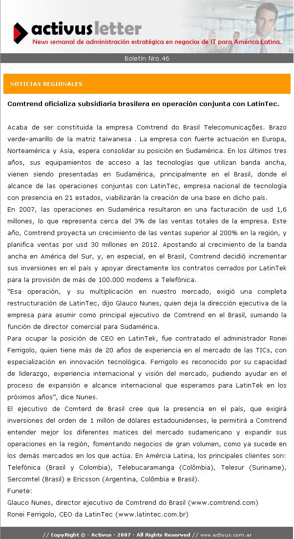 Clipping Boletim de Notícias Activus Letter (Argentina) - Comtrend abre filial brasilera en operacion conjunta con LatinTec 13/11/2008