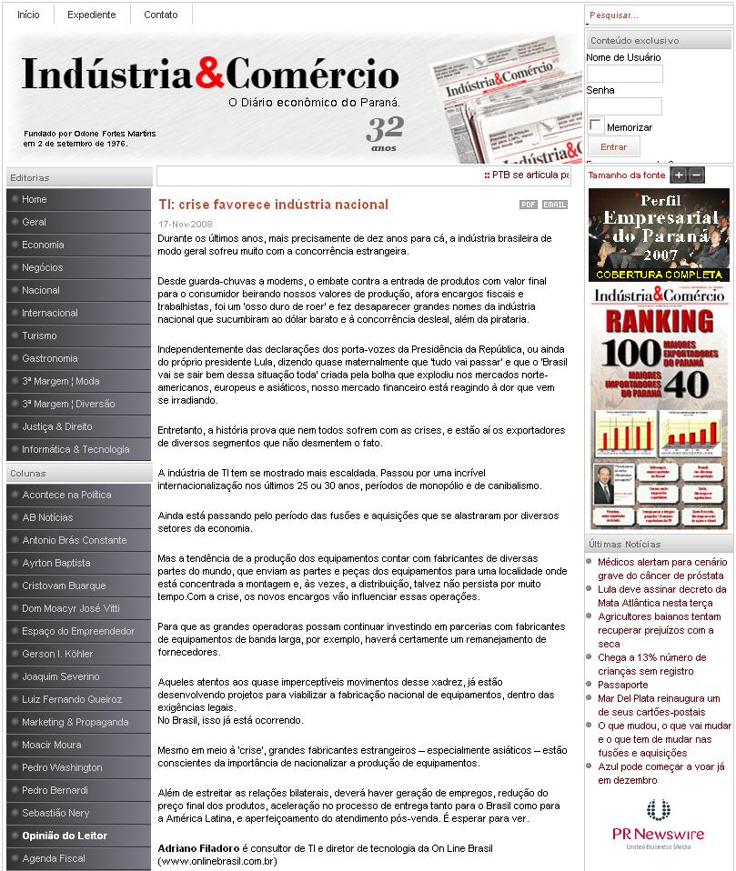 Jornal Indústria & Comércio (17 Nov) - TI: crise favorece indústria nacional