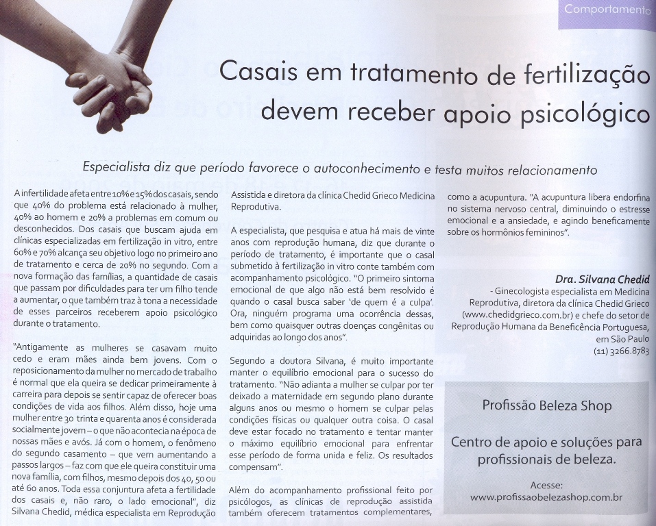 Clipping Revista Profissão Beleza (Dez) - Casais em tratamento de fertilização devem receber apoio psicológico 08/12/2008