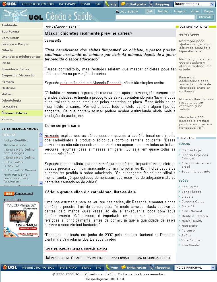 Portal UOL (Ciência & Saúde) - Mascar chicletes realmente previne cáries?