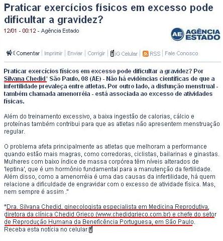 Clipping Agência Estado (AE) - Praticar exercícios físicos em excesso pode dificultar a gravidez? 12/01/2009