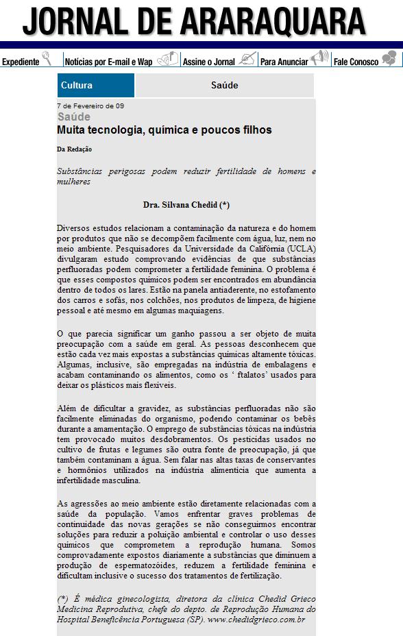 Jornal de Araraquara (7 Fev) - Muita tecnologia, química e poucos filhos