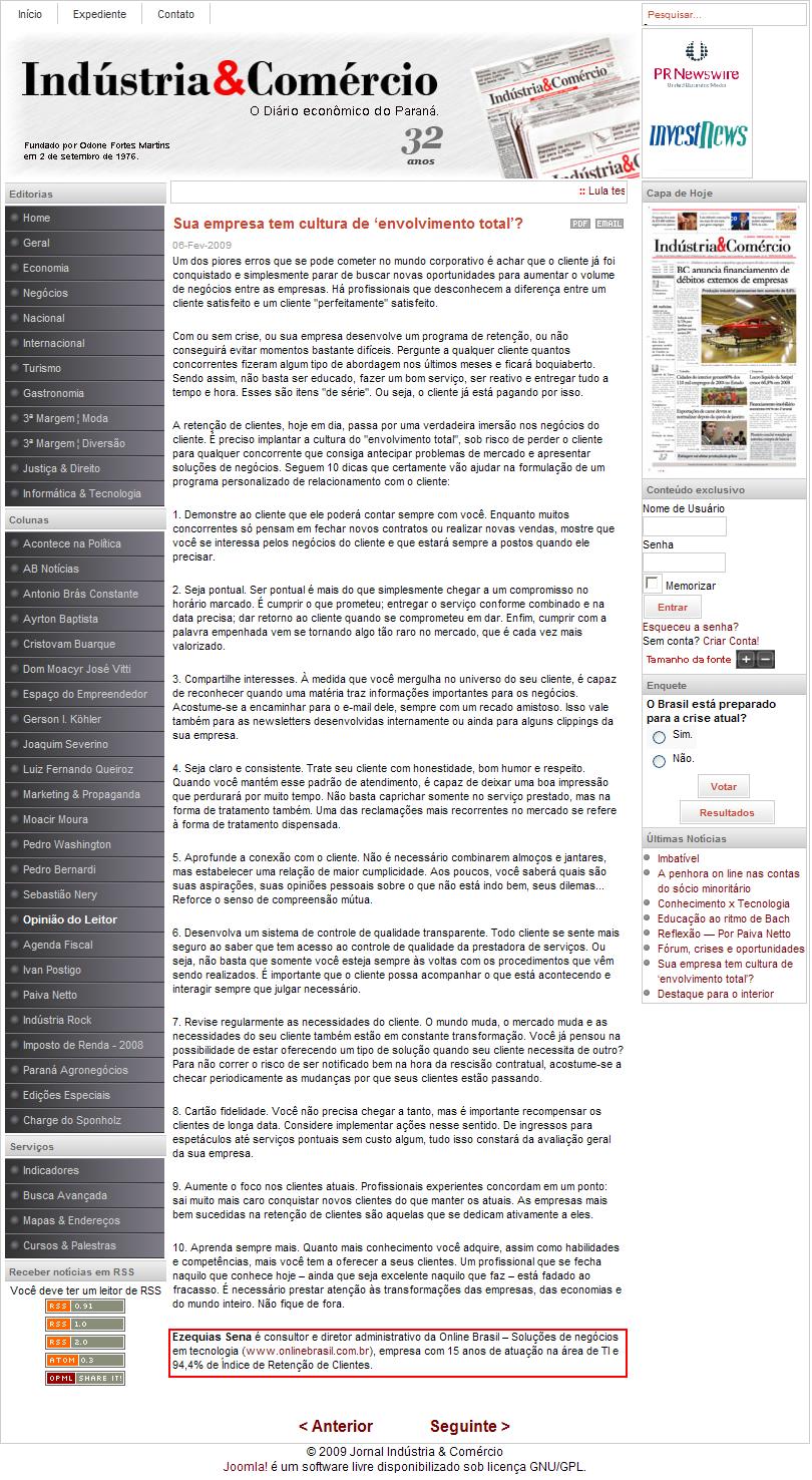 Clipping Jornal Indústria & Comércio (6 Fev) - Sua empresa tem cultura de envolvimento de dados? 09/02/2009
