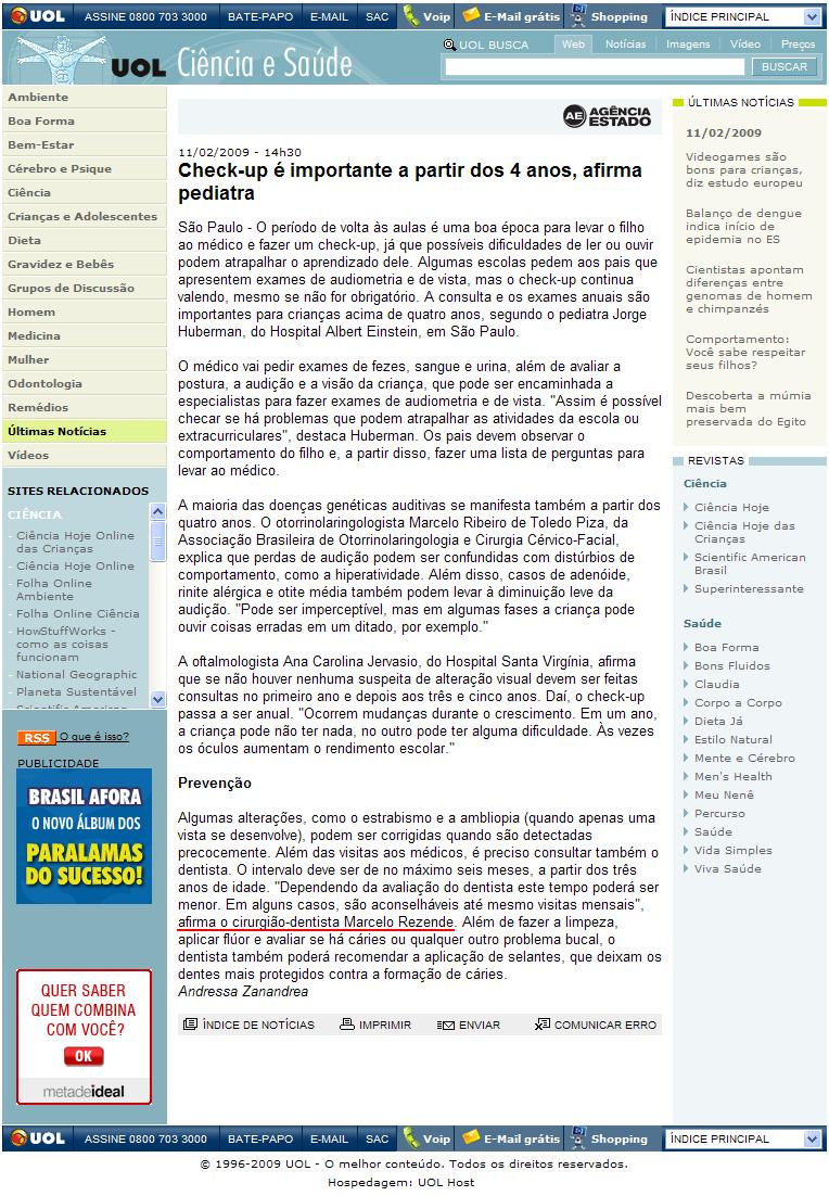Clipping Portal UOL (Ciência & Saúde) - Check-up é importante a partir dos 4 anos, afirmam especialistas 11/02/2009