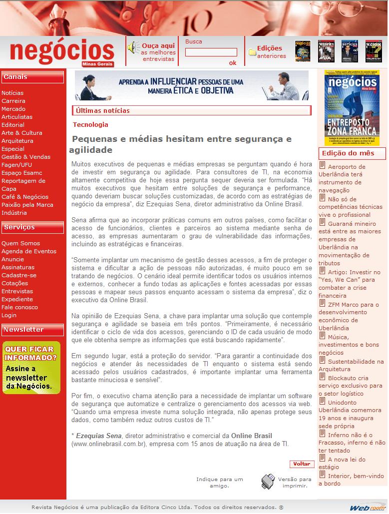 Clipping Revista Negócios MG Digital - Pequenas e médias hesitam entre segurança e agilidade 18/02/2009