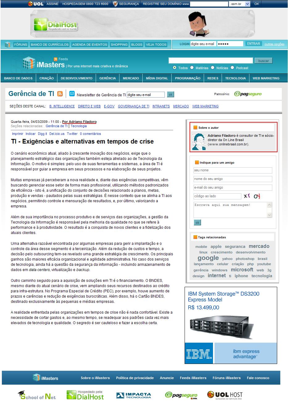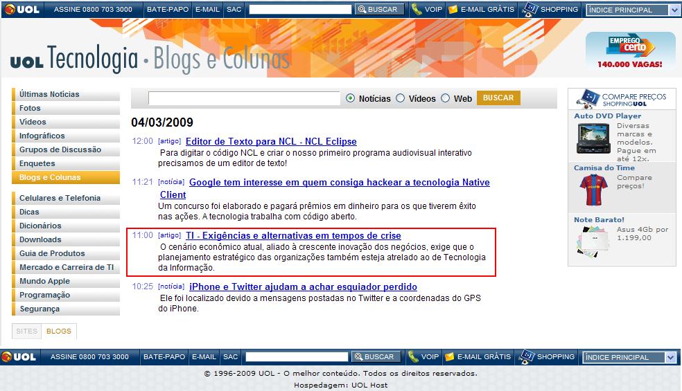 Portal UOL (Tecnologia) - TI: exigências e alternativas em tempos de crise