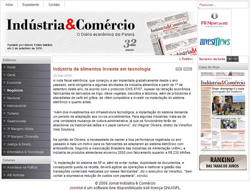 Clipping Jornal Indústria & Comércio (23 Mar) - Indústria de alimentos investe em tecnologia 23/03/2009