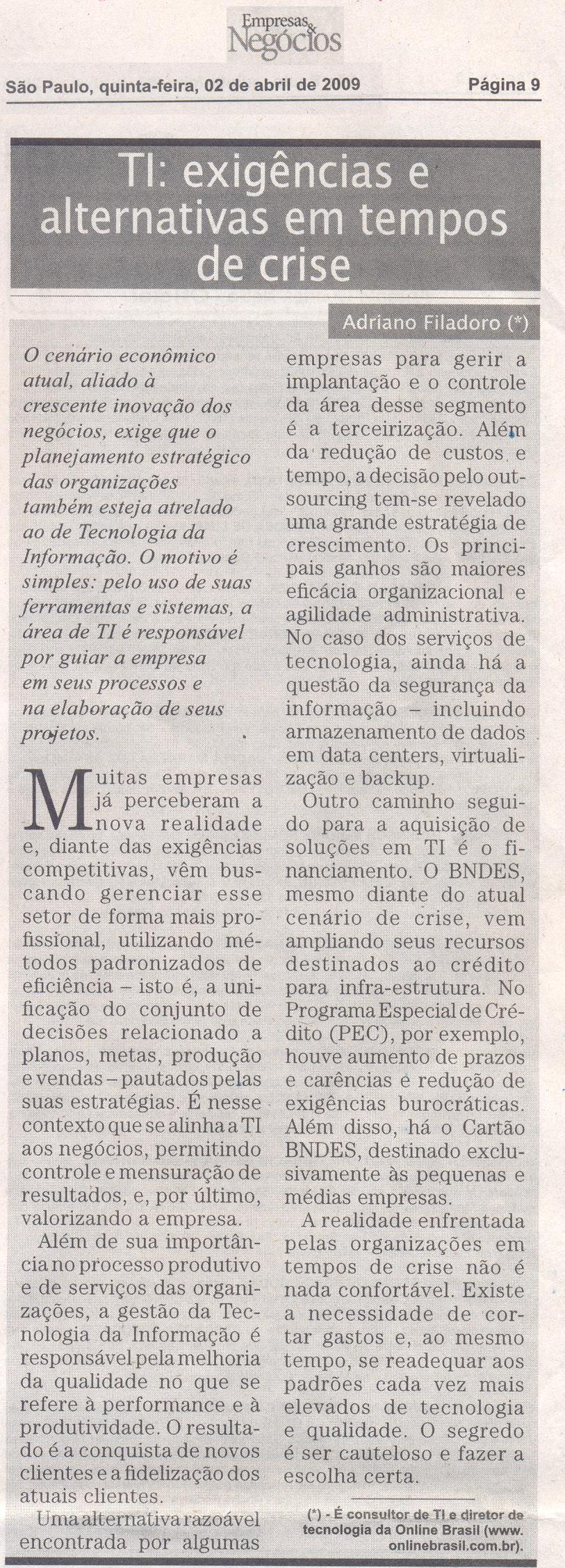 Clipping Jornal Empresas & Negócios (2 Abr) - TI: exigências e alternativas em tempos de crise 17/04/2009