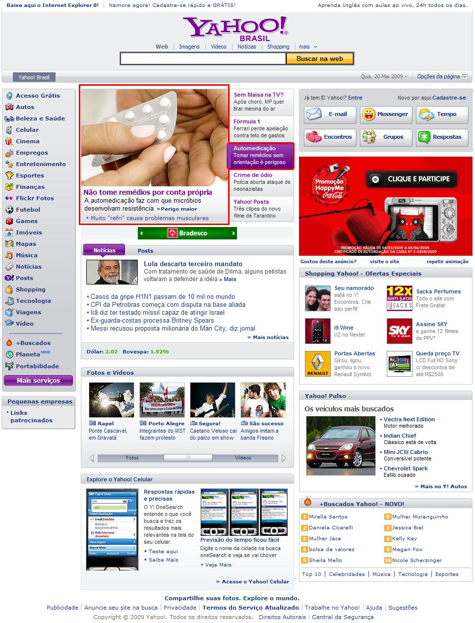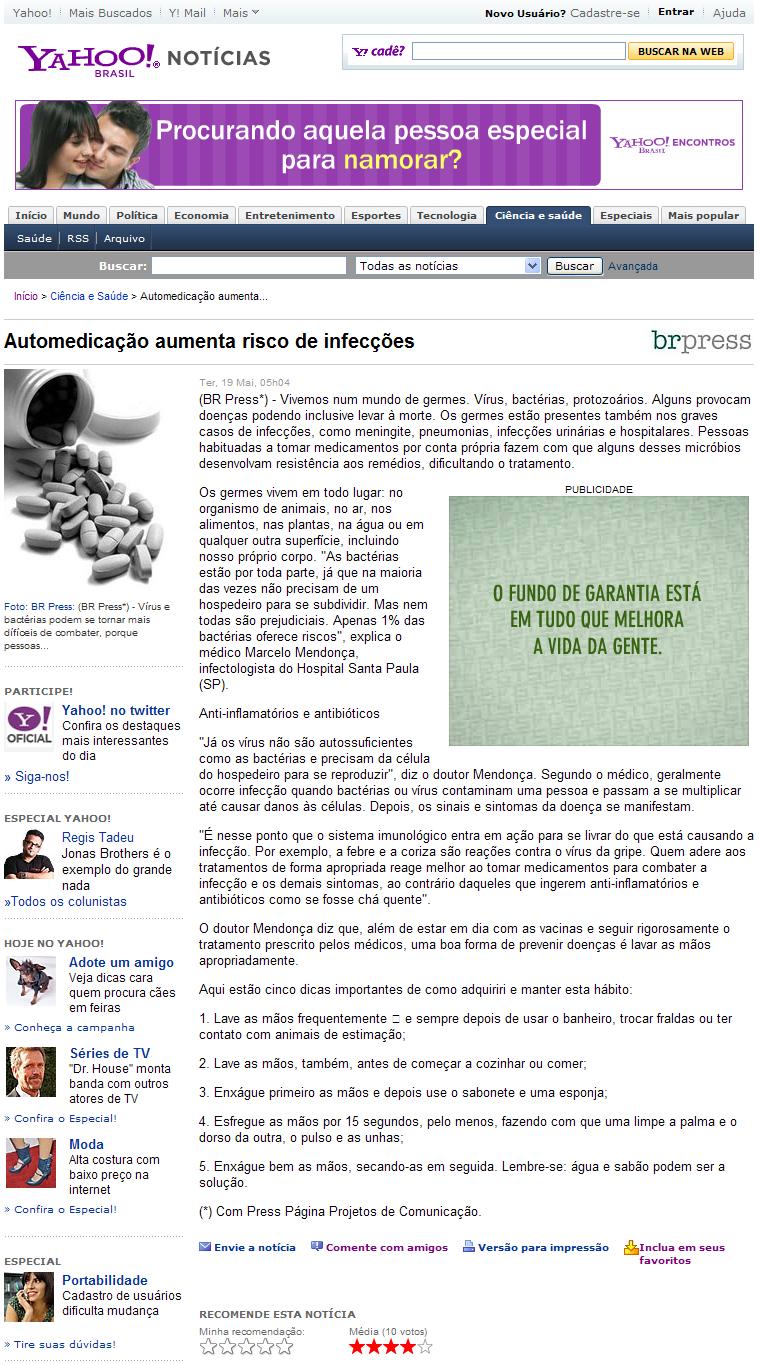 Clipping Portal Yahoo (Chamada de capa + matéria) - Automedicação aumenta risco de infecções 20/05/2009