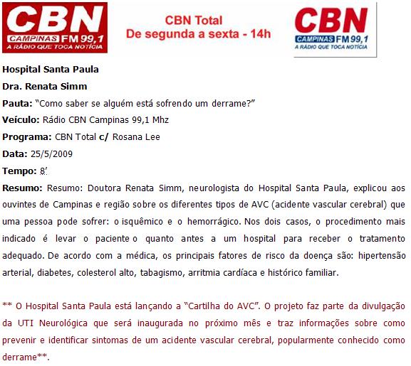 Rádio CBN Campinas FM 99,1 Mhz - Dra. Renata Simm / Hospital Santa Paula
