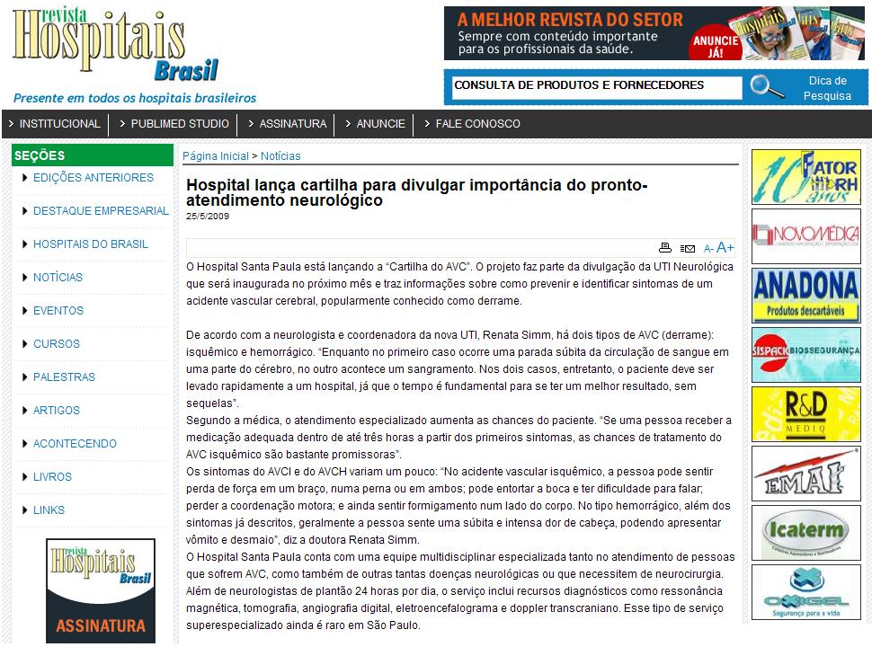 Clipping Revista Hospitais Brasil digital - Hospital lança cartilha para divulgar importância do pronto-atendimento neurológico 26/05/2009