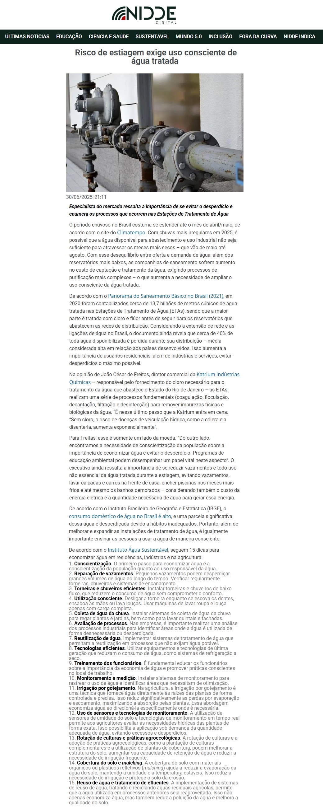 NIDDE DIGITAL (SITE) - Risco de estiagem exige uso consciente de água tratada