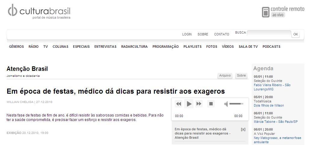 Clipping RÁDIO CULTURA PROGRAMA ATENÇÃO BRASIL - Em época de festas, médico dá dicas para resistir aos exageros 04/01/2011