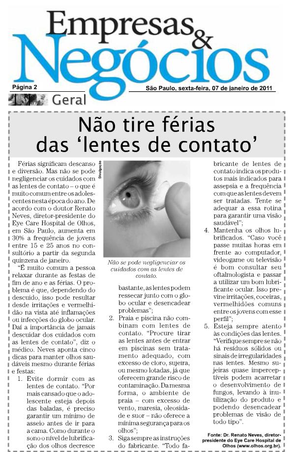 Clipping JORNAL EMPRESAS & NEGÓCIOS (IMPRESSO E DIGITAL) - Não tire férias das 'lentes de contato' 10/01/2011