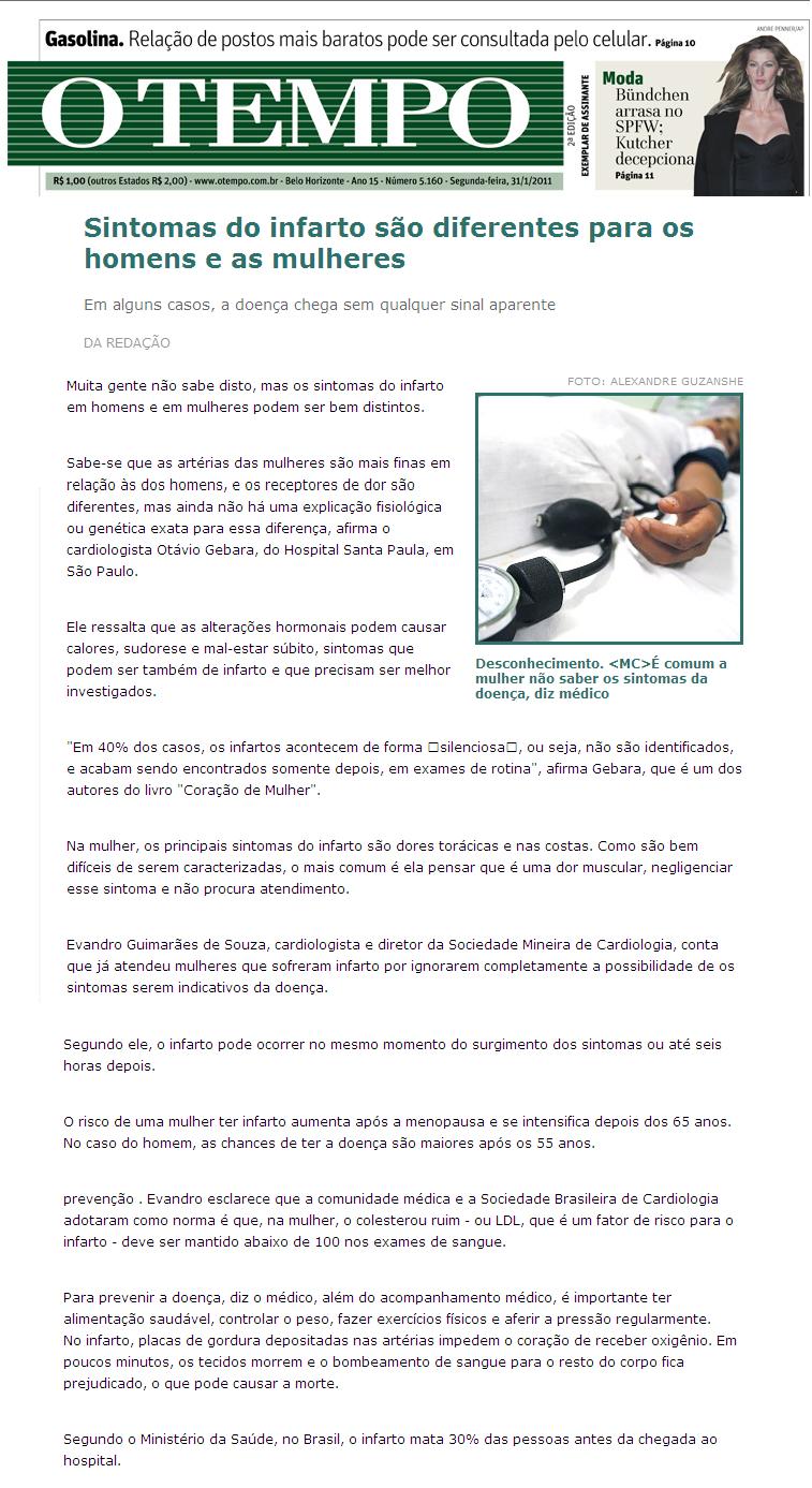 Clipping JORNAL O TEMPO (IMPRESSO, DIGITAL E ONLINE/MG) - Sintomas do infarto são diferentes para os homens e as mulheres 31/01/2011