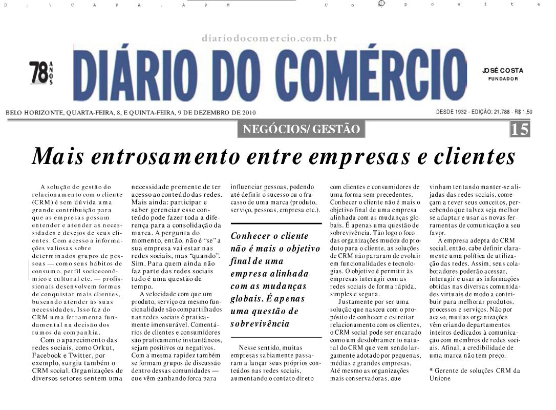 Clipping DIÁRIO DO COMÉRCIO (IMPRESSO, DIGITAL E ONLINE/MG) - Mais entrosamento entre empresas e clientes 25/02/2011