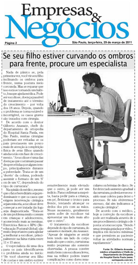 Clipping JORNAL EMPRESAS & NEGÓCIOS (IMPRESSO E DIGITAL) - Se seu filho estiver curvando os ombros pra frente, procure um especialista 29/03/2011